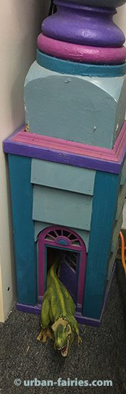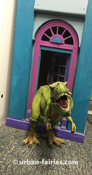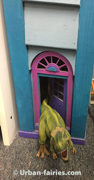Looking over, I noted a tyrannosaurus by the fairy door in the base of the urban-fairy lighthouse. At Least he was smiling!