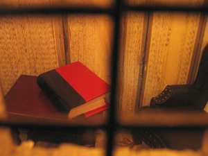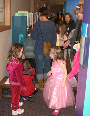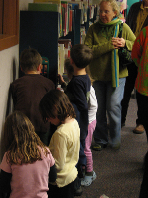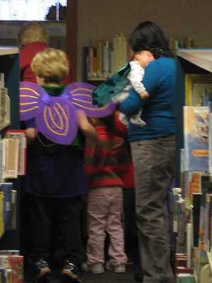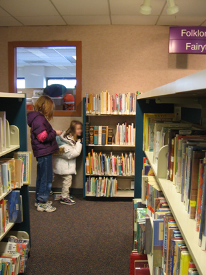 | On November 5, 2006 The day after finding the fairy door at the Ann Arbor District Library, I discovered fairy-finders there. The younger lady had a bit of conversation with the bookshelf. |