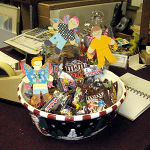 Lori just phoned this morning. Apparently THESE flat fairies >> have abandoned the rest (at least for now). They are STILL hovering around the candy bowl! |