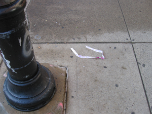 Yet again...over night ANOTHER 500 tickets gone. HOWEVER, the evdience left behind gives further clues for forensics. I found 15 1/3 tickets on the sidewalk.... |