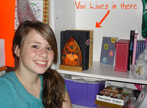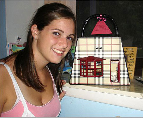 Ashleigh with Everlyse's "Burberry" purse fairy-house.