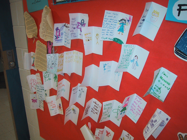 It was Connie who tipped me off to the door there. If you have any questions about THAT one, you'll have to ask her, she is the expert. She also did a wonderful literacy /art project with the 2nd graders there. There have been letters from the fairy. The second graders each created a fairy door which opens to reveal their letter and a drawing of a fairy! |